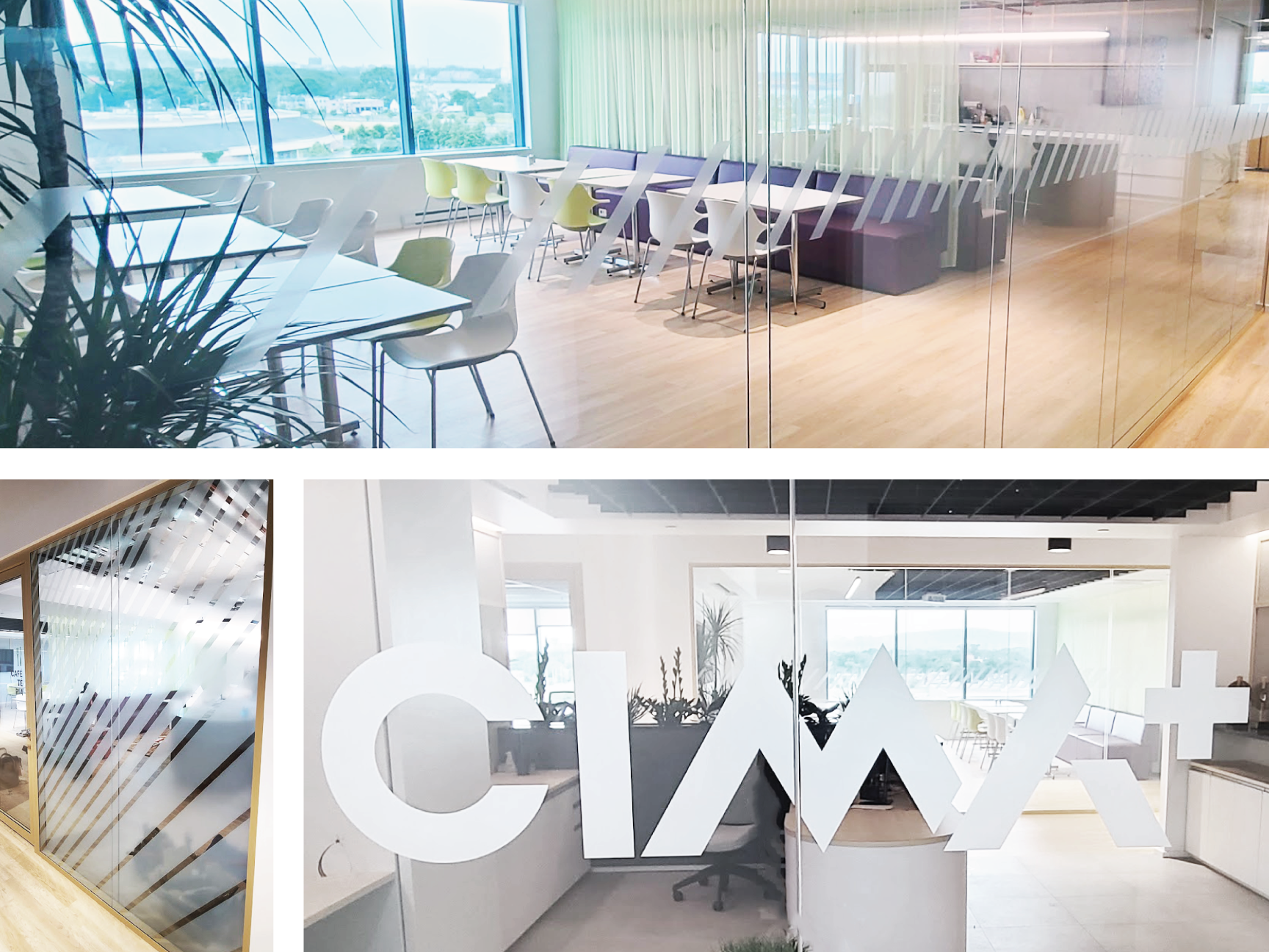 Découpe personnalisée du logo et d’éléments graphiques pour les bureaux de CIMA+. Un projet visant à renforcer la présence de marque et à dynamiser les espaces vitrés par un jeu subtil de transparence.