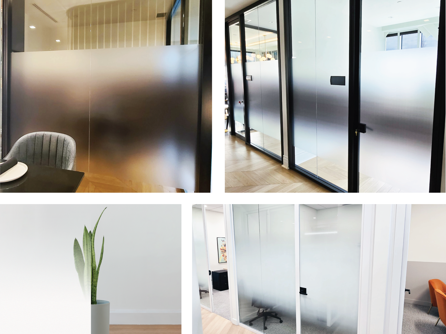 Chaque espace requiert un équilibre unique entre luminosité et confidentialité. Nos vinyles givrées sont offerts en différents degrés d’opacité, permettant d’ajuster le niveau d’intimité tout en préservant la clarté et l’élégance des lieux.