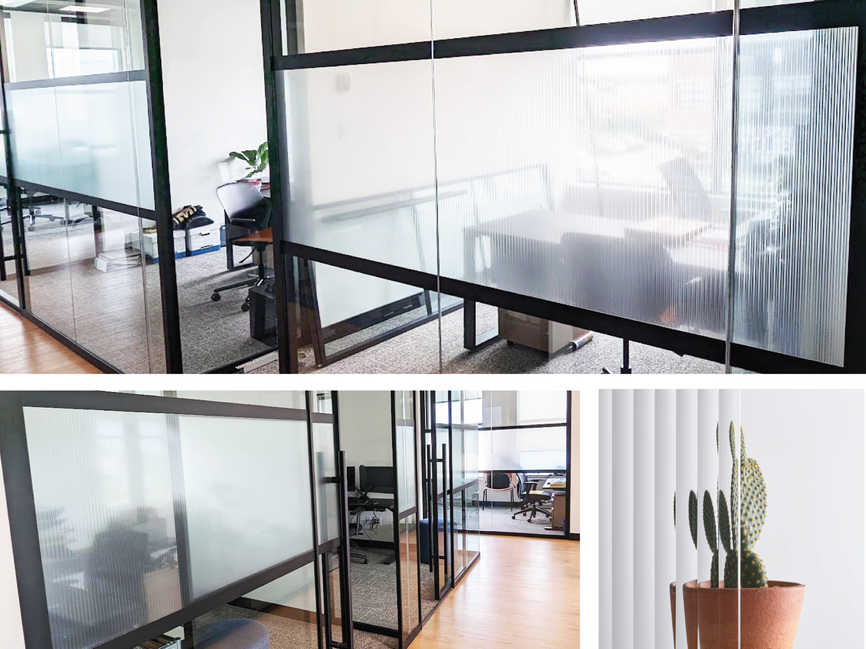 Pose d’un vinyle à effet ondulé pour offrir intimité et diffusion de la lumière dans un environnement corporatif moderne. Fini texturé à l’apparence du verre cannelé à moindre coût, tout en s’intégrant harmonieusement à l’architecture existante.